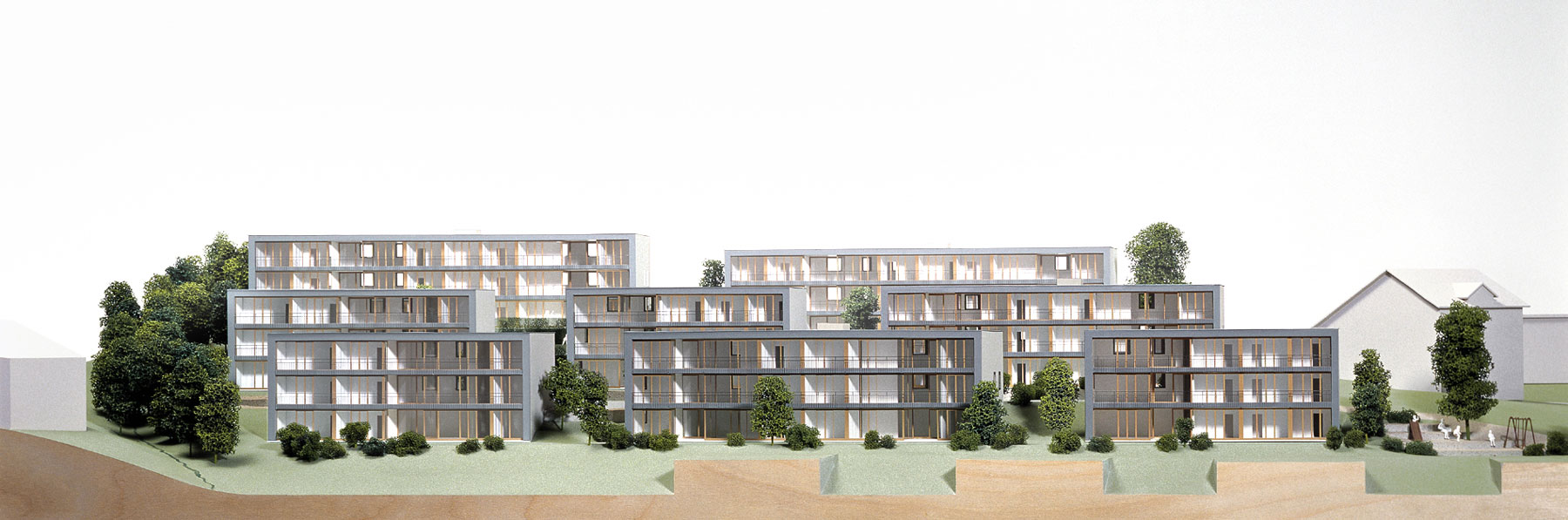 Die schlanken, rechteckigen Baukörper ermöglichen allen Wohnungen von den Qualitäten der Lage zu profitieren. Sämtliche Zimmer, Wohnräume und Loggien sind nach Süden orientiert. Ein durchgehender, offener Balkon ergänzt die privaten eingeschriebenen Loggien, verleiht der Südfassade eine Tiefe, wie auch einen Witterungsschutz und gliedert sie horizontal.